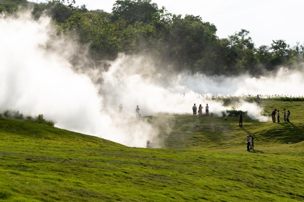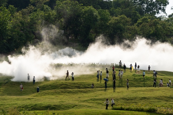 3. ม่านหมอกบริสุทธิ์จากระบบน้ำสะอาด ปราศจากมลพิษ เป็นมิตรต่อสิ่งแวดล้อม - ประติมากรรมหมอก เกิดจากการใช้หลักการทางฟิสิกส์และวิทยาศาสตร์มาประยุกต์ใช้กับงานศิลปะ ไม่ว่าจะเป็น เครื่องปั๊มแรงดันสูง, ท่อน้ำ, และหัวฉีดขนาดเล็กจำนวนมาก ที่ได้รับการติดตั้งอย่างแม่นยำในพื้นที่จัดแสดง ควบคู่กับการใช้เทคโนโลยีสุดล้ำจาก ‘Aquaria’ แบรนด์แรกของโลกที่คิดค้นและพัฒนาเครื่องผลิตน้ำจากอากาศที่ทั้งสะอาดและดื่มได้อย่างปลอดภัย โดยระบบจะฉีดน้ำสะอาดผ่านหัวฉีดขนาดเล็กจิ๋ว ทำให้เกิดละอองน้ำที่มีเส้นผ่านศูนย์กลาง 20-30 ไมครอน ซึ่งเล็กพอที่จะลอยในอากาศเหมือนหมอกตามธรรมชาติ ละอองน้ำที่ปล่อยออกมาจะลอยตัวอยู่ในอากาศเกิดเป็นม่านหมอกที่เย็นสบายและสะอาดบริสุทธิ์ แล้วยังช่วยเพิ่มความชุ่มชื้นในอากาศได้อย่างดี ผู้ชมจึงสามารถดื่มด่ำกับประสบการณ์ศิลปะได้อย่างปลอดภัยและหายใจได้เต็มปอด