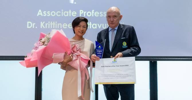 ศาสตราจารย์ ดร. เอียน เฟนวิค (Professor Ian Fenwick, Ph.D.) ผู้อำนวยการ สถาบันบัณฑิตบริหารธุรกิจ ศศินทร์ แห่งจุฬาลงกรณ์มหาวิทยาลัย (Sasin School of Management) มอบรางวัลอาจารย์ผู้สอนดีเลิศ ประจำปี 2568 ให้กับ รศ. ดร.กฤตินี ณัฏฐวุฒิสิทธิ์ อาจารย์ประจำสาขาการตลาด การมอบรางวัลนี้เพื่อเป็