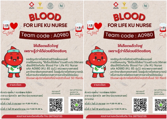 คณะพยาบาลศาสตร์ มหาวิทยาลัยเกษตรศาสตร์ ทีม Blood For Life KU Nurse รหัส A0980 (KU 85 รุ่น1) ร่วมกับ ศูนย์บริการโลหิตแห่งชาติ สภากาชาดไทย และมูลนิธิดั่งพ่อสอน จัดกิจกรรมรณรงค์เชิ
