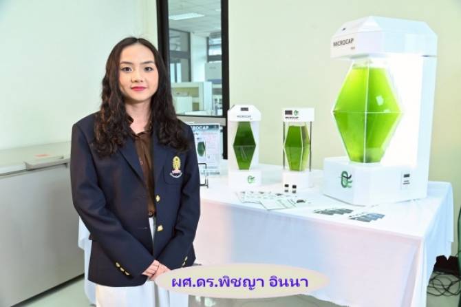 MICROCAP เครื่องผลิตออกซิเจนด้วยพลังจุลสาหร่าย - “สังคมเริ่มสนใจเรื่อง Carbon Neutrality1 และการดักจับก๊าซคาร์บอนไดออกไซด์ก็เป็นหนึ่งในปัญหาระดับโลก อาจารย์เลยอยากเป็นผู้เชี่ยวชาญทางด้านนี้ แต่ก็อยากใช้เทคโนโลยีที่แหวกแนวสักหน่อยและควรเป็นวิธีเลียนแบบธรรมชาติที่ไม่ทำร้ายสิ่งแวดล้อม นั้นก็คือเทคโนโลยีจุลสาหร่าย” ผศ. ดร.พิชญากล่าว และอธิบายเสริมว่าจุลสาหร่ายในเครื่อง MICROCAP จะทำหน้าที่เสมือนเป็นต้นไม้ภายในบ้านและอาคาร ช่วยดักจับก๊าซคาร์บอนไดออกไซด์และเปลี่ยนเป็นก๊าซออกซิเจนได้มากกว่าต้นจามจุรีได้ถึง 20 เท่า!