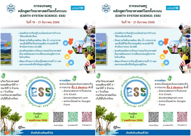 - สสวท. พัฒนาศักยภาพครูเปิดอบรมหลักสูตรวิทยาศาสตร์โลกทั้งระบบ (ESS) 26 ต.ค. 2568