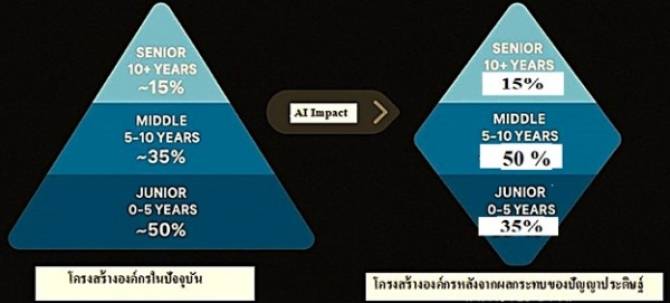 นอกจากนี้ในองค์กรยุคใหม่ โครงสร้างแรงงานที่เคยเป็นพีระมิด (Pyramid) – ที่ส่วนใหญ่เป็น Junior-level – กำลังเปลี่ยนแปลงไปสู่รูปแบบรูปเพชร (Diamond) ที่ประชากรส่วนใหญ่เป็นระดับ Middle-level แทน บัณฑิตจบใหม่ที่จบจากระบบการศึกษายังสิ่งเดิมซึ่งเตรียมไว้สำหรับงานระดับเริ่มต้นอาจประสบกับความท้าทายอย่างหนัก เพราะงานระดับ Entry Level ซึ่งเป็นพื้นที่ฝึกประสบการณ์ที่เคยเปิดกว้าง กำลังถูก AI เข้ามาแทนมากขึ้น โอกาสในการเริ่มงานที่ “เรียนจบแล้วเริ่มต้นจากล่าง” เพื่อนำประสบการณ์มาเติบโตในองค์กร อาจลดน้อยลง หากบัณฑิตไม่ได้ถูกเตรียมไว้ให้ “พร้อมทำงานจริง” ตั้งแต่เริ่ม – ก็อาจเสียเปรียบตั้งแต่ยังไม่เริ่มแข่งขัน
