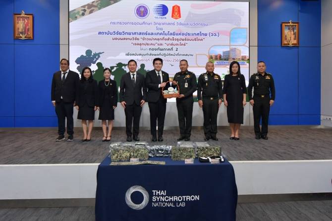 เมื่อวันที่ 7 พ.ย. 2568 นายสุรศักดิ์ พันธ์เจริญวรกุล รัฐมนตรีว่าการกระทรวงการอุดมศึกษา วิทยาศาสตร์ วิจัยและนวัตกรรม (อว.) เป็นประธานในพิธีส่งมอบอุปกรณ์การแพทย์ภาคสนามที่พัฒนาโดยสถาบันวิจัยแสงซินโครตรอน (องค์การมหาชน) (สซ.) ให้แก่กองทัพภาคที่ 2 ประกอบด้วย สายรัดห้ามเลือดแบบก้านหมุน (Tourniquet) จำนวน 1,000 ชุด และ เฝือกอ่อน (Splint) จำนวน 500 ชุด รวม 1,500 ชุด เพื่อใช้ในราชการสนาม ลดการเสียชีวิตของกำลังพลบริเวณชายแดนจากภาวะเลือดออกรุนแรงและกระดูกหัก โดยมี พลโท วีระยุทธ รักศิลป์ แม่ทัพภาคที่ 2 เป็นผู้รับมอบ และมี น.ส.พิมพ์พร ชีวานันท์ เลขานุการ รมว.กระทรวง อว. , น.ส.วราภรณ์ รุ่งตระการ รองปลัดกระทรวง อว., ดร.พันธุ์เพิ่มศักดิ์ อารุณี ผู้ช่วยปลัดกระทรวง อว. รศ.ดร.สาโรช รุจิรวรรธน์ ผอ.สซ., ผศ.ดร.วีรชัย อาจหาญ ผู้ว่าการ วว., ศ.ดร.ชูกิจ ลิมปิจำนงค์ ผอ.สวทช. และพลตรี ณรงค์ ภักดีศุภผล ผอ.โรงพยาบาลค่ายสุรนารี เข้าร่วม ที่ห้องแถลงข่าว ชั้น 1 สำนักงานปลัดกระทรวงการอุดมศึกษา วิทยาศาสตร์ วิจัยและนวัตกรรม ถนนพระรามที่ 6 กรุงเทพฯ
