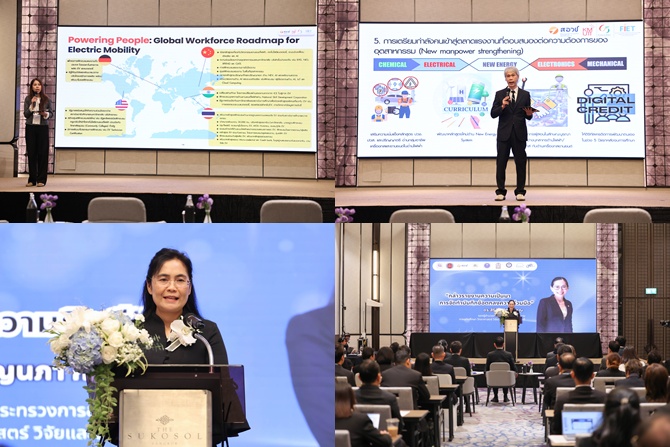 ดร.สิริพร กล่าวว่า พิธีลงนามในครั้งนี้ เป็นจุดเริ่มต้นของความร่วมมือระยะเวลา 5 ปี ที่มีความหมายอย่างยิ่งต่อการขับเคลื่อนประเทศ เพราะเกิดจากพลังของภาครัฐ ภาคการศึกษา และภาคเอกชน ที่ร่วมผนึกกำลัง กันอย่างเป็นระบบและเป็นรูปธรรม เพื่อตอบโจทย์อนาคตของประเทศไทยในอุตสาหกรรมยานยนต์ไฟฟ้า ความร่วมมือครั้งนี้มีเป้าหมายในการพัฒนากำลังคนให้พร้อมรับต่อการเปลี่ยนแปลงของโลก ตั้งแต่การเตรียมบุคลากรรุ่นใหม่ในระบบการศึกษา การยกระดับทักษะของแรงงาน และการพัฒนาศักยภาพบุคลากรในสถานประกอบการ ผ่านการร่วมกันออกแบบหลักสูตรทั้งรูปแบบ degree และ non-degree หลักสูตรเฉพาะทาง การฝึกอบรม การฝึกงาน รวมถึงการรับรองมาตรฐานวิชาชีพและมาตรฐานฝีมือแรงงานแห่งชาติ เราจะมุ่งเน้นการ Upskill — Reskill — และ Newskill เพื่อสร้างระบบการเรียนรู้ที่ไม่เพียงสอดรับกับความต้องการ ของอุตสาหกรรม แต่ยังนำพาให้ประเทศไทยเป็นผู้นำในยุคยานยนต์ไฟฟ้าอย่างแท้จริง สอวช. มีบทบาทสำคัญ