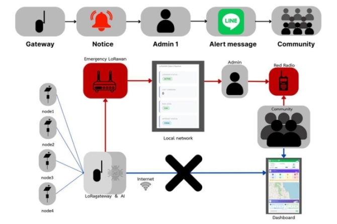 ระบบนี้ถูกออกแบบให้ทำงานผ่านเครือข่ายการสื่อสาร 2 ระดับ เพื่อให้มั่นใจได้ว่าการแจ้งเตือนจะดำเนินไปอย่างต่อเนื่องในทุกสถานการณ์ โดยในภาวะปกติ อุปกรณ์เกตเวย์จะส่งข้อมูลจากโหนดเซ็นเซอร์ทั้ง 5 จุด ไปยังผู้ดูแลระบบเพื่อวิเคราะห์ความเสี่ยงด้วย AI ก่อนแจ้งเตือนผ่านแอปพลิเคชัน LINE และหน้าจอสรุปผลของเว็บไซต์ (Web Dashboard) แบบเรียลไทม์ ส่วนในภาวะฉุกเฉิน (ไฟฟ้าดับ/อินเทอร์เน็ตล่ม) ระบบสื่อสารสำรอง LoRaWAN จะส่งสัญญาณเตือนภัยโดยตรงไปยังผู้ดูแลระบบ ซึ่งจะใช้วิทยุสื่อสาร (ว.แดง) กระจายข่าวแจ้งเตือนประชาชนในพื้นที่ทันที
