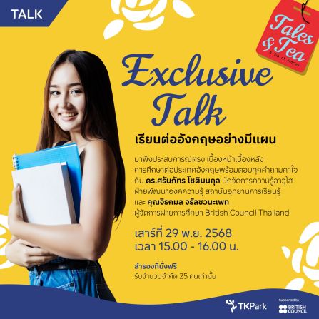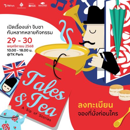 สถาบันอุทยานการเรียนรู้ (TK Park) ร่วมกับพันธมิตรมากมาย ชวนคนรักการอ่าน มาร่วมสัมผัสวัฒนธรรม “อังกฤษ” แบบครบทุกรส ในโอกาสครบรอบ 170 ปี แห่งการสถาปนาความสัมพันธ์ทางการทูตไทย–สหราชอาณาจักร กับกิจกรรม “Tales & Tea: A Sip of Stories” เปิดเรื่องเล่า จิบชา เริ่มต้นบทสนทนาใหม่ ค้นพบแรงบันดาลใจใหม่จากหนังสือที่ถ่ายทอดความสัมพันธ์ วัฒนธรรมไทย–อังกฤษ และเปิดมุมมองใหม่ที่จะทำให้รู้จัก “อังกฤษ” มากกว่าที่เคย พร้อมร่วมเพลิดเพลินกับกิจกรรมต่าง ๆ มากมาย ณ อุทยานการเรียนรู้ TK Park ชั้น 8 centralwOrld ในวันเสาร์ที่ 29 และวันอาทิตย์ที่ 30 พฤศจิกายน 2568 เวลา 10:00–18:00 น.