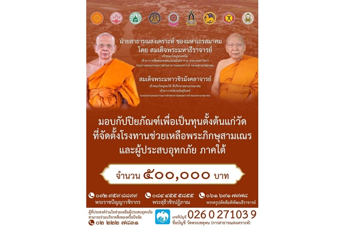 - "สมเด็จพระมหาธีราจารย์" มอบปัจจัยจัดตั้งโรงทาน เร่งช่วยเหลือผู้ประสบภัยน้ำท่วมหาดใหญ่ 25 พ.ย. 2568