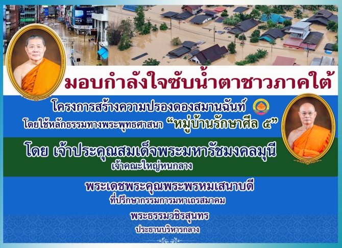 - "สมเด็จธงชัย" สั่งการด่วน! "พระธรรมวชิรสุนทร" ประธานศีล 5 และคณะ ลงพื้นที่ช่วยพระภิกษุสามเณรและผู้ประสบภัยน้ำท่วมใต้ 26 พ.ย. 2568