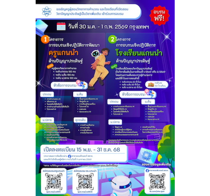 - สสวท.อบรมฟรี “ครูแกนนำ-โรงเรียนแกนนำ AI ทั่วประเทศ” 28 พ.ย. 2568