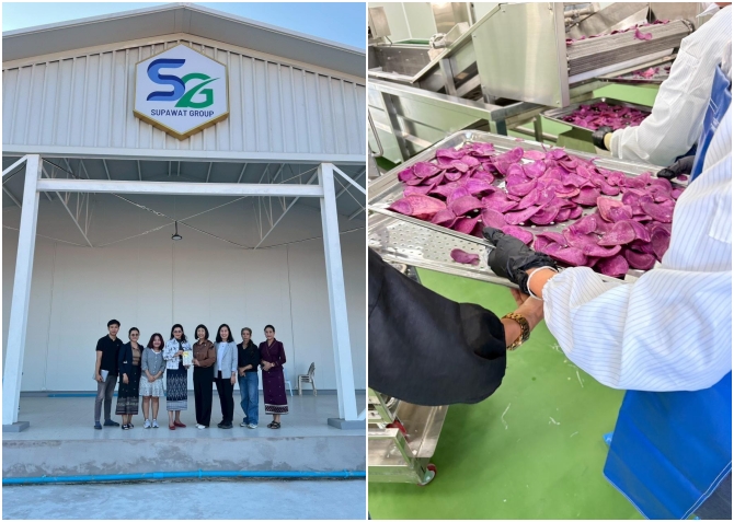 ผศ.ดร.อารยา เชาว์เรืองฤทธิ์ คณบดีคณะเทคโนโลยี มหาวิทยาลัยขอนแก่น พร้อมด้วย รศ.ดร.จันทิมา ภูงามเงิน นักวิจัยผู้พัฒนาผลิตภัณฑ์มันม่วงอบกรอบ ได้ลงพื้นที่ตรวจสอบระบบเครื่องจักรภายในโรงงานแปรรูปผลไม้อบกรอบ SUPAWAT Group Sole Co., Ltd. เขตไซท้าย นครหลวงเวียงจันทน์ สาธารณรัฐประชาธิปไตยประชาชนลาว พร้อมให้คำแนะนำด้านการปรับปรุงกระบวนการผลิต เพื่อเพิ่มประสิทธิภาพและความสม่ำเสมอของผลิตภัณฑ์ ตลอดจนยกระดับมาตรฐานการผลิตให้พร้อมขยายสู่ตลาดอุตสาหกรรมอาหารในภูมิภาค