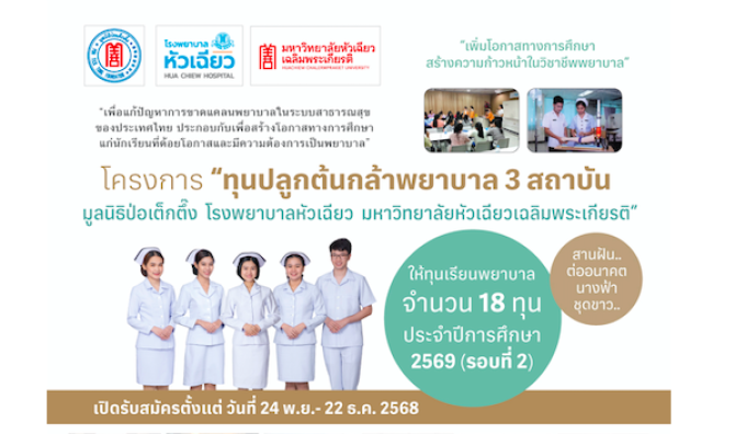 มูลนิธิป่อเต็กตึ๊ง ร่วมกับโรงพยาบาลหัวเฉียว และ มหาวิทยาลัยหัวเฉียวเฉลิมพระเกียรติให้ทุนเรียนพยาบาลในโครงการ “ปลูกต้นกล้าพยาบาล 3 สถาบัน” ประจำปีการศึกษา 2569 (รอบที่ 2)เพื่อมุ่งสนับสนุนนักเรียนที่มีผลการเรียนดี มีใจรักพยาบาล แต่ขาดแคลนทุนทรัพย์ได้มีโอกาสก้าวสู่เส้นทางวิชาชีพพยาบาลอย่างมั่นคง ตลอดหลักสูตรระดับปริญญาตรี 4 ปี จำนวน 18 ทุน ทุนละ852,000 บาท รวมการสนับสนุนกว่า 15 ล้านบาท พร้อมบริการหอพักนักศึกษาโดยไม่เสียค่าใช้จ่ายซึ่งได้รับการสนับสนุนเพิ่มเติมจากโรงพยาบาลหัวเฉียว