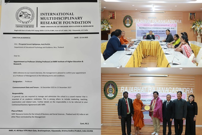 เมื่อวันที่ 16 ธันวาคม 2568 พระปลัดสรวิชญ์ อภิปญฺโญ อาจารย์ประจำสาขาวิชาจิตวิทยาการศึกษาและการแนะแนว คณะครุศาสตร์ มหาวิทยาลัยมหาจุฬาลงกรณราชวิทยาลัย (มจร) เปิดเผยในโอกาสได้รับการแต่งตั้งให้ดำรงตำแหน่ง Professor (Visiting Professor) ณ International Multidisciplinary Research Foundation (IMRF) – Institute of Higher Education & Research ประเทศอินเดีย