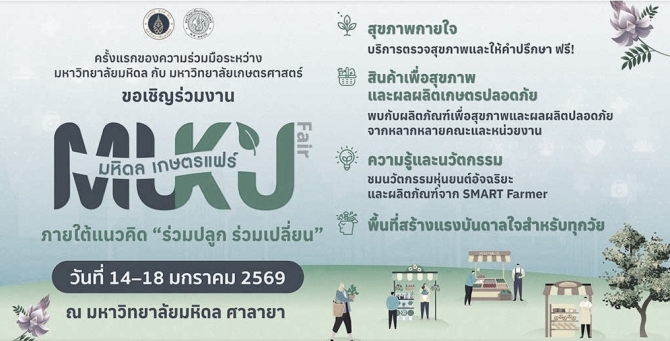 14-18 มกราคม 2569 ขอเชิญร่วมงาน “มหิดล เกษตรแฟร์” ซึ่งจะจัดขึ้นครั้งแรก ณ มหาวิทยาลัยมหิดล ศาลายา