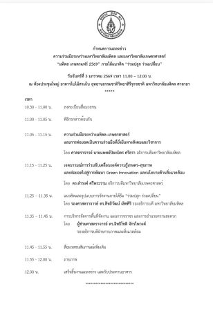 - 14-18 มกราคม 2569 ขอเชิญร่วมงาน “มหิดล เกษตรแฟร์” ซึ่งจะจัดขึ้นครั้งแรก ณ มหาวิทยาลัยมหิดล ศาลายา 29 ธ.ค. 2568