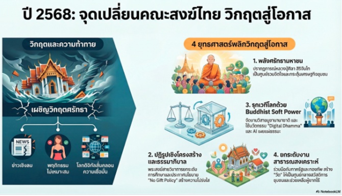 ปี 2568 ไม่ได้เป็นเพียงปีแห่งวิกฤตศรัทธา หากแต่เป็นปีแห่ง “โอกาสและการตื่นรู้” ของคณะสงฆ์ไทย ที่กำลังปรับสมดุลครั้งใหญ่ โดยผสานพลังศรัทธา ปัญญาทางวิชาการ เทคโนโลยีสมัยใหม่ และความเมตตาทางสังคม เพื่อธำรงพระพุทธศาสนาให้ยังคงเป็นเสาหลักทางจิตวิญญาณและสังคมไทยในโลกยุคใหม่อย่างยั่งยืน