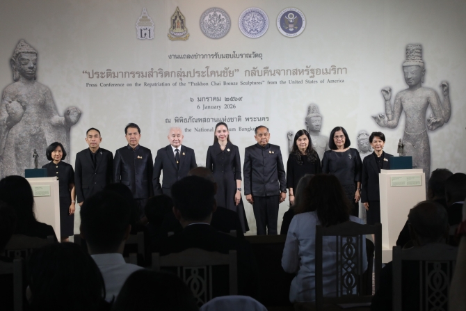 นางสาวซาบีดา ไทยเศรษฐ์ รัฐมนตรีว่าการกระทรวงวัฒนธรรม เป็นประธานในงานแถลงข่าวการรับมอบโบราณวัตถุ “ประติมากรรมสำริดกลุ่มประโคนชัย” จากพิพิธภัณฑ์ศิลปะเอเชีย ซานฟรานซิสโก ประเทศสหรัฐอเมริกา กลับคืนสู่มาตุภูมิ ณ พระที่นั่งอิศราวินิจฉัย พิพิธภัณฑสถานแห่งชาติ พระนคร โดยการได้รับมอบโบราณวัตถุประโคนชัยกลับคืนมาในครั้งนี้ มีความสำคัญยิ่งต่อคุณค่าทางประวัติศาสตร์และโบราณคดีที่ประเมินค่ามิได้ โบราณวัตถุเหล่านี้เป็นหลักฐานสำคัญที่บอกเล่าถึงความรุ่งเรืองของชุมชนโบราณในพื้นที่ภาคตะวันออกเฉียงเหนือของไทย ที่ช่วยยืนยันถึงการมีอยู่ของเมือง “ศรีจนาศะ” เมืองโบราณที่มีศูนย์กลางอยู่บริเวณลุ่มแม่น้ำมูลและที่ราบสูงโคราช โบราณวัตถุเหล่านี้เป็นสัญลักษณ์ของความศรัทธาในพุทธศาสนา และเป็นหลักฐานของภูมิปัญญาด้านโลหกรรมขั้นสูงของผู้คนบนผืนแผ่นดินไทย การติดตามประติมากรรมสำริดกลับคืนมาครั้งนี้ได้สำเร็จ เป็นความร่วมมือของคณะกรรมการติดตามโบราณวัตถุของไทยในต่างประเทศ กรมศิลปากร กระทรวงการต่างประเทศ และสำนักงานสืบสวนความมั่นคงแห่งมาตุภูมิสหรัฐอเมริกา (Homeland Security Investigations: HSI) ที่ร่วมกันทำงานอย่างเข้มแข็งมาตั้งแต่ปีพุทธศักราช 2561 แสดงให้เห็นถึงความมุ่งมั่นของรัฐบาลไทยในการปกป้องมรดกทางศิลปวัฒนธรรมของชาติ และต้องขอขอบคุณพิพิธภัณฑ์ศิลปะเอเชีย ซานฟรานซิสโก ที่ให้ความร่วมมือในการส่งคืนมรดกสำคัญครั้งนี้แก่ประเทศไทย และหวังว่าความสำเร็จในวันนี้ จะเป็นนิมิตหมายอันดีในการติดตามโบราณวัตถุรายการอื่น ๆ กลับคืนสู่ประเทศไทยในอนาคต เพื่อรักษาไว้เป็นมรดกที่แสดงถึงรากวัฒนธรรมของผู้คนบนแผ่นดินไทย และส่งต่อเป็นความรู้แก่ลูกหลานสืบไป