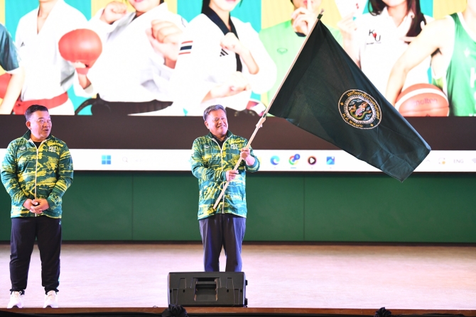 จากนั้น ประธานในพิธีได้โบกธงประจำมหาวิ