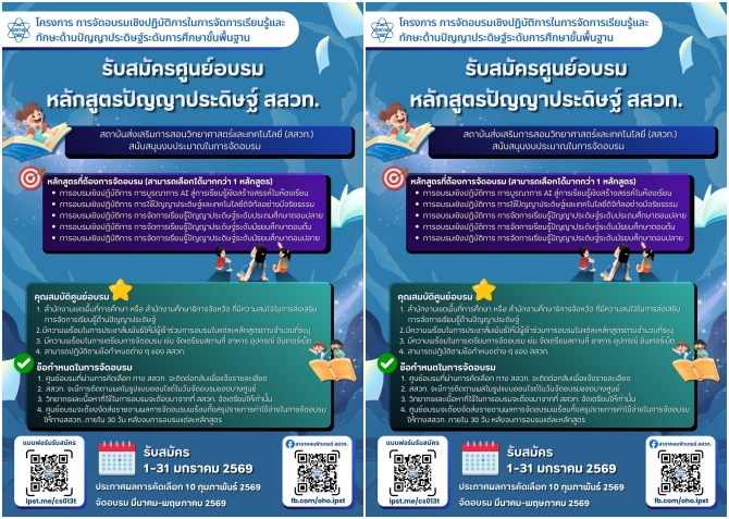 สถาบันส่งเสริมการสอนวิทยาศาสตร์และเทคโนโลยี (สสวท.) ขอเชิญสำนักงานเขตพื้นที่การศึกษา และสำนักงานศึกษาธิการจังหวัดทั่วประเทศ สมัครเป็นศูนย์อบรมหลักสูตรปัญญาประดิษฐ์ สสวท. โดย สสวท. สนับสนุนงบประมาณในการจัดอบรม เพื่อส่งเสริมการให้ความรู้ด้านปัญญาประดิษฐ์ และสร้างเครือข่ายในการส่งเสริมการจัดการเรียนรู้ด้านปัญญาประดิษฐ์ รวมถึงยกระดับศักยภาพครูและการเรียนรู้ของผู้เรียนให้มีความรู้ความสามารถเท่าทันต่อการเปลี่ยนแปลงของสังคมโลกและทัดเทียมกับนานาชาติ เปิดรับสมัครตั้งแต่วันนี้ ถึง 31 มกราคม 2569 ผ่านแบบฟอร์มออนไลน์ที่ https://ipst.me/cs013t ประกาศผลการคัดเลือก วันที่ 10 กุมภาพันธ์ 2569 และจะจัดอบรมในช่วงเดือนมีนาคม–พฤษภาคม 2569 ดูรายละเอียดเพิ่มเติมได้ที่เพจ สาขาคอมพิวเตอร์ สสวท. https://www.facebook.com/oho.ipst