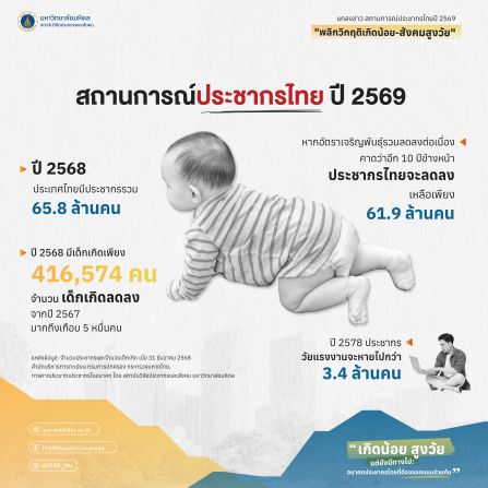 เมื่อ วันที่ 12 มกราคม 2569 สถาบันวิจัยประชากรและสังคม มหาวิทยาลัยมหิดล เปิดเผย “สถานการณ์ประชากรไทย ปี 2569” ชี้ชัดว่า ประเทศไทยกำลังก้าวเข้าสู่จุดเปลี่ยนสำคัญของโครงสร้างประชากร จากปรากฏการณ์ “เกิดน้อย อายุยืน และแรงงานหดตัว” อย่างรวดเร็ว จนกำลังจะเข้าสู่ สังคมสูงวัยระดับสุดยอด (Super Aged Society) คือมีผู้สูงอายุ 60 ปีขึ้นไปมากกว่าร้อยละ 28 ภายในเวลาไม่ถึง 10 ปีข้างหน้า พร้อมเน้นย้ำว่า วิกฤตประชากรครั้งนี้ไม่ใช่ทางตัน หากแต่เป็นโอกาสสำคัญในการ “ปฏิรูปคุณภาพคน” และวางนโยบายระยะยาวเพื่อความมั่นคงของประเทศ