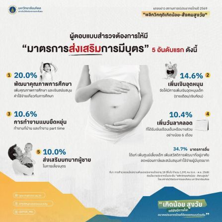 แม้ตัวเลขการเกิดจะลดลงอย่างน่ากังวล แต่ผลสำรวจออนไลน์ความคิดเห็นของประชาชนชนไทย อายุ 18 ปีขึ้นไป จำนวน 1,591 คน (สถานการณ์ประชากรและสังคม ปี 2568) โดยสถาบันวิจัยประชากรและสังคม มหาวิทยาลัยมหิดล พบว่า คนรุ่นใหม่ โดยเฉพาะ Gen Y และ Gen Z ส่วนใหญ่ยังต้องการมีบุตร เพื่อเติมเต็มชีวิตครอบครัว ปัญหาสำคัญไม่ได้อยู่ที่ “ไม่อยากมีลูก” แต่อยู่ที่ ความไม่มั่นคงทางเศรษฐกิจ ค่าครองชีพสูง ภาระหนี้สิน การขาดศูนย์ดูแลเด็กที่เข้าถึงได้ และเวลาทำงานที่ไม่ยืดหยุ่น นอกจากนี้ผลสำรวจยังชี้ว่า มาตรการ “แจกเงิน” เพียงอย่างเดียวไม่เพียงพอ ประชาชนให้ความสำคัญกับ คุณภาพการศึกษา เวลาทำงานที่ยืดหยุ่น และระบบสนับสนุนครอบครัวมากกว่า เพื่อสร้างความมั่นใจในการเลี้ยงดูบุตรในระยะยาว