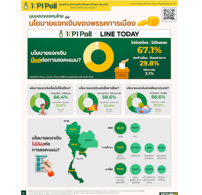 KPI Poll สำรวจความคิดเห็น “มุมมองของคน ไทยต่อนโยบายแจกเงินของพรรคการเมือง”