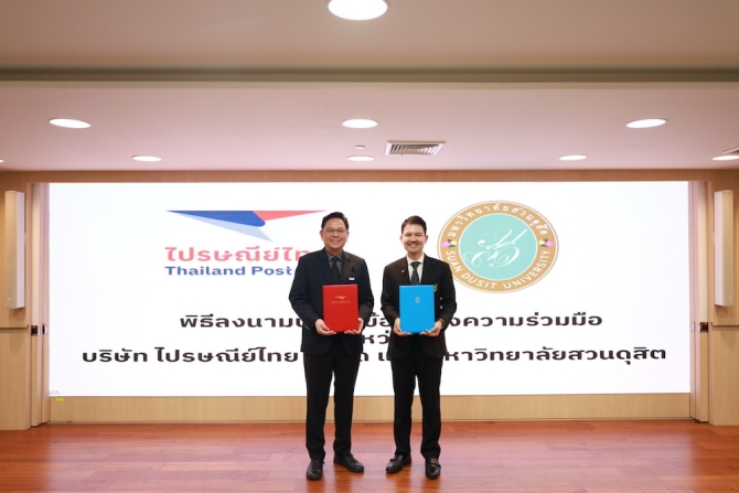บริษัท ไปรษณีย์ไทย จำกัด และ มหาวิทยาลัยสวนดุสิต จัดพิธีลงนามบันทึกข้อตกลงความร่วมมือ ทางวิชาการ เพื่อขับเคลื่อนโครงการวิจัยและพัฒนาระบบตลาดออนไลน์และการขนส่งสินค้าเกษตร หวังสร้างต้นแบบเศรษฐกิจชุมชนที่ยั่งยืน โดยได้รับเกียรติจาก รองศาสตราจารย์ ดร.ชนะศึก นิชานนท์ รองอธิการบดีฝ่ายบริหาร วิจัยและนวัตกรรม มหาวิทยาลัยสวนดุสิต และคุณพิษณุ วานิชผล ประธานเจ้าหน้าที่บริหารสายงานพัฒนาประสิทธิภาพองค์กร และรักษาการประธานเจ้าหน้าที่บริหารสายงานกลยุทธ์และการขับเคลื่อนองค์กร ลงนามความร่วมมือ โดยการลงนามความร่วมมือมีวัตถุประสงค์เพื่อร่วมมือกันศึกษา วิจัยและพัฒนาโครงการวิจัยเพื่อพัฒนาองค์ความรู้ด้านเทคโนโลยีออนไลน์มาร์เก็ตเพลสและการขนส่งสินค้ากุ้งก้ามกราม มีชีวิตผ่านกระบวนการขนส่งของ ปณท ให้มีความเหมาะสมกับสินค้าและประสิทธิภาพของของผู้บริโภค รวมถึงส่งเสริมการสร้างระบบนิเวศที่เอื้อต่อการพัฒนามาร์เก็ตเพลสออนไลน์ในการดำเนินธุรกิจผู้ประกอบการ และส่งเสริมเศรษฐกิจชุมชนที่ยั่งยืน