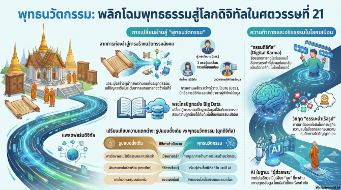ท่ามกลางกระแสเทคโนโลยีดิจิทัลที่เปลี่ยนโฉมโลกอย่างถอนรากถอนโคน ศาสนาพุทธกำลังยืนอยู่ ณ จุดเปลี่ยนสำคัญทางประวัติศาสตร์ จากยุคที่ “วัด” คือศูนย์กลางความรู้และพิธีกรรม สู่ยุคที่ “ธรรมะ” กลายเป็นข้อมูลดิจิทัลที่ไหลเวียนอยู่บนแพลตฟอร์มออนไลน์ เข้าถึงได้เพียงปลายนิ้ว การเปลี่ยนผ่านดังกล่าวไม่เพียงกระทบวิธีการเผยแผ่ธรรม แต่ยังสั่นคลอนโครงสร้างอำนาจ ความศักดิ์สิทธิ์ และความน่าเชื่อถือของสถาบันสงฆ์ในสังคมร่วมสมัย