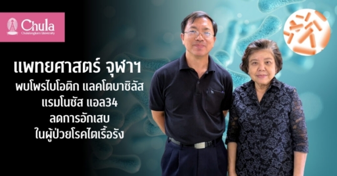 แพทยศาสตร์ จุฬา วิจัยค้นพบโพรไบโอติกแลคโตบาซิลัส แรมโนซัส แอล34 ซึ่งช่วยลดสารพิษยูรีเมียและไซโตไคน์ที่เกี่ยวข้องกับการอักเสบเพื่อช่วยผู้ป่วยโรคไตเรื้อรังในระยะก่อนล้างไต ปัจจุบัน ร่วมมือกับบริษัทยาพัฒนาผลิตภัณฑ์เสริมอาหารโพรไบโอติกสัญชาติไทยเพื่อคนไทย