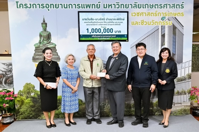 ดร.ดำรงค์ ศรีพระราม รักษาการแทนอธิการบดีมหาวิทยาลัยเกษตรศาสตร์ รับมอบเงินบริจาค จำนวน 1,000,000 บาท เพื่อคณะแพทยศาสตร์และโรงพยาบาลเกษตรศาสตร์ จาก นายวันชัย - นางอัสนี ปานนาคะพิทักษ์ นิสิตเก่ามหาวิทยาลัยเกษตรศาสตร์ เพื่ออุทิศส่วนกุศลให้ นางศศิเพ็ญ ,นางสาวดวงแข และนายวันชาติ เวชชศาสตร์ (ปานนาคะพิทักษ์) เมื่อวันที่ 16 กุมภาพันธ์ 2569 ณ สำนักงานอธิการบดี อาคารสารนิเทศ 50 ปี มหาวิทยาลัยเกษตรศาสตร์