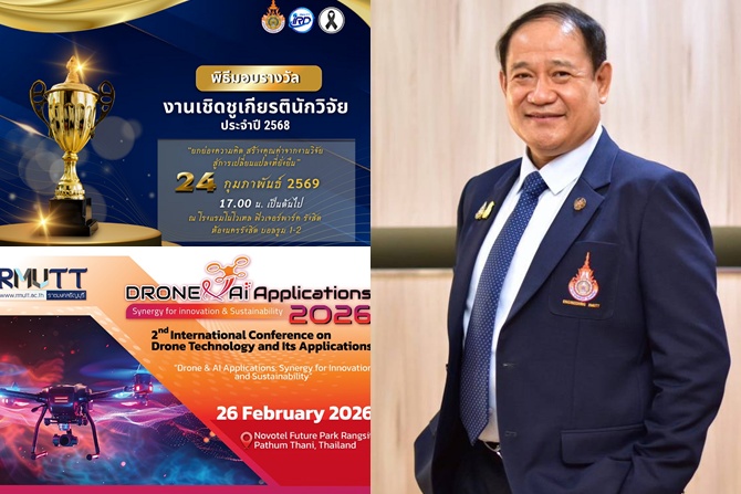 เมื่อวันที่ 20 กุมภาพันธ์ 2569 รศ.ดร.สมหมาย ผิวสอาด อธิการบดีมหาวิทยาลัยเทคโนโลยีราชมงคลธัญบุรี (มทร.ธัญบุรี) เปิดเผยว่า ด้วยนโยบายของมหาวิทยาลัยที่มีความมุ่งมั่นขับเคลื่อนยุทธศาสตร์การเป็น Innovation University มทร.ธัญบุรี จึงได้จัดงานใหญ่ 2 งาน ประกอบด้วย พิธีมอบรางวัลเชิดชูเกียรติ ประจำปี 2568 จัดโดยสถาบันวิจัยและพัฒนา เพื่อยกย่องบุคลากรที่อุทิศตนสร้างสรรค์งานวิจัยคุณภาพสูง และสามารถนำไปใช้ประโยชน์ได้จริงอย่างเป็นรูปธรรม และการประชุมวิชาการด้านเทคโนโลยีและนวัตกรรมอากาศยานไร้คนขับระดับนานาชาติ ครั้งที่ 2 (2nd International Conference on Drone Technology and Its Applications) ภายใต้แนวคิด Drone & AI Applications : Synergy for Innovation and Sustainability จัดโดยสำนักวิทยบริการและเทคโนโลยีสารสนเทศ เพื่อยกระดับขีดความสามารถของประเทศไทยในเวทีโลก