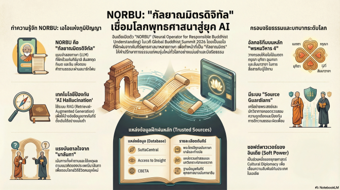 วงการพุทธศาสนาโลกจับตาความเคลื่อนไหวครั้งสำคัญ หลังอินเดียเปิดตัว “NORBU” (Neural Operator for Responsible Buddhist Understanding) ปัญญาประดิษฐ์ด้านพุทธศาสนา ในเวทีการประชุมสุดยอดพุทธศาสนาระดับโลก ครั้งที่ 2 หรือ Global Buddhist Summit 2026 ณ ศูนย์ประชุม Bharat Mandapam กรุงนิวเดลี