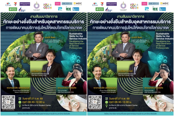 วิทยาลัยการท่องเที่ยวและอุตสาหกรรมการบริการ มหาวิทยาลัยรังสิต ขอเชิญชวนเข้าร่วมงานสัมมนาวิชาการด้านอุตสาหกรรมบริการ ภายใต้หัวข้อ “ทักษะอย่างยั่งยืนสำหรับอุตสาหกรรมบริการ: การพัฒนาคนบริการรุ่นใหม่ให้ตอบโจทย์โลกอนาคต: Sustainable Skills for the Service Industry: Developing the Next Generation of Service Professionals” ในวันศุกร์ที่ 27 กุมภาพันธ์ 2569 เวลา 09.00 – 12.00 น. ณ ห้อง 6-200 ชั้น 2 อาคาร Student Center (อาคาร 6) มหาวิทยาลัยรังสิต