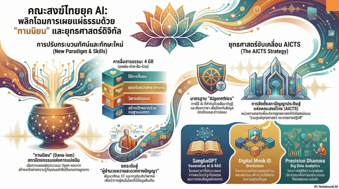 การก้าวเข้าสู่ยุคปัญญาประดิษฐ์ไม่ใช่ภัยคุกคาม หากแต่เป็นบททดสอบความสามารถของคณะสงฆ์ไทยในการรักษาสมดุลระหว่าง “แก่นธรรม” กับ “เทคโนโลยี” ข้อเสนอ AICTS และกระบวนทัศน์ทานนิยมสะท้อนความพยายามสร้างอธิปไตยทางดิจิทัลทางศาสนา