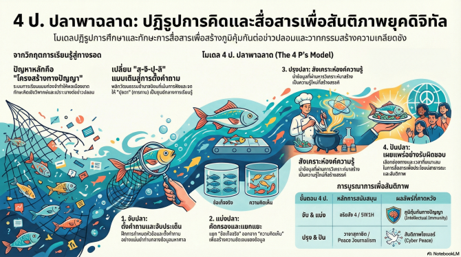 ช่วงท่ามกลางแรงสั่นสะเทือนจากวิกฤตโควิด-19 ที่เร่งให้สังคมไทยก้าวสู่โลกดิจิทัลอย่างฉับพลัน งานวิจัยเชิงวิเคราะห์ได้เสนอกรอบคิด “4ป.ปลาพาฉลาด” เป็นเครื่องมือปฏิรูปการศึกษาและการสื่อสารเพื่อสันติภาพ โดยชี้ว่าปัญหาหลักไม่ได้อยู่ที่เทคโนโลยี หากแต่อยู่ที่ “โครงสร้างทางปัญญา” และวุฒิภาวะของผู้ใช้สื่อ