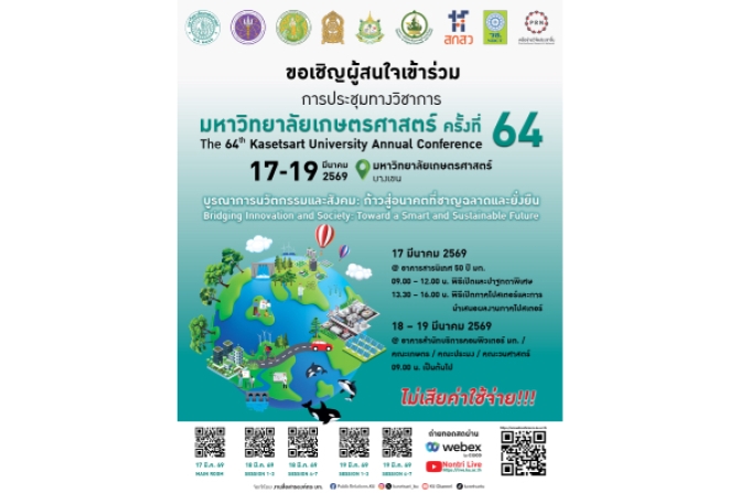 มหาวิทยาลัยเกษตรศาสตร์ ร่วมกับพันธมิตร จัดการประชุมทางวิชาการครั้งที่ 64 ภายใต้แนวคิด “บูรณาการนวัตกรรมและสังคม: ก้าวสู่อนาคตที่ชาญฉลาดและยั่งยืน” หรือ “Bridging Innovation and Society: Toward a Smart and Sustainable Future” ระหว่างวันที่ 17 -19 มีนาคม 2569 ณ มหาวิทยาลัยเกษตรศาสตร์ เพื่อแลกเปลี่ยนความรู้ทางวิชาการ ความก้าวหน้าทางเทคโนโลยีและวิทยาการสมัยใหม่ การคิดค้นสิ่งประดิษฐ์ใหม่ ๆ ตลอดจนสนับสนุนการเผยแพร่ผลงานที่ได้จากการศึกษาค้นคว้างานวิจัยสู่สาธารณชนเพื่อเป็นประโยชน์ต่อการพัฒนาประเทศ ผ่านการปาฐกถาพิเศษ บรรยายพิเศษ เสวนาพิเศษ จำนวน 24 เรื่องและนำเสนอผลงานวิจัยภาคบรรยายและโปสเตอร์ รวม 177 เรื่อง ผู้สนใจสามารถเข้ารับฟังการบรรยายพิเศษและการนำเสนอผลงานวิจัยได้โดยไม่เสียค่าใช้จ่าย