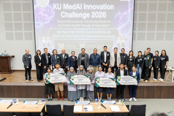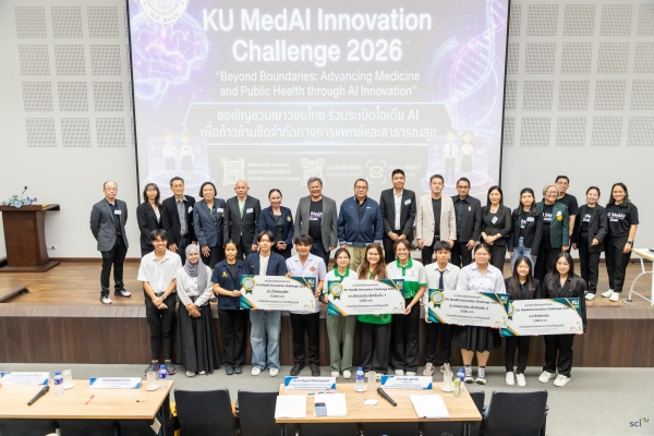 มหาวิทยาลัยเกษตรศาสตร์ (มก.) ประกาศความสำเร็จในการเป็นศูนย์กลางขับเคลื่อน “นวัตกรรมสุขภาพดิจิทัล” ของไทย ผ่านการจัดการแข่งขัน “KU MedAI Innovation Challenge 2026” รอบชิงชนะเลิศ ภายใต้แนวคิด “Beyond Boundaries: Advancing Medicine and Public Health Through AI Innovation” เมื่อวันที่ 7 มีนาคม 2569 ณ อาคารวิทยาศาสตร์กายภาพ 45 ปี คณะวิทยาศาสตร์ มก. ซึ่งเวทีนี้ไม่เพียงแต่เป็นการประลองไอเดีย แต่คือการสร้างระบบนิเวศแห่งการเรียนรู้ (Learning Ecosystem) ที่เชื่อมโยงศาสตร์ด้านเทคโนโลยีปัญญาประดิษฐ์เข้ากับระบาดวิทยาและการแพทย์ เพื่อเป้าหมายสุขภาวะที่ดีของมวลมนุษยชาติ โดยมี 5 คณะหลักด้านวิทยาศาสตร์สุขภาพร่วมเป็นเจ้าภาพจัดการแข่งขัน ได้แก่ คณะวิทยาศาสตร์ และภาควิชาวิทยาการคอมพิวเตอร์ คณะแพทยศาสตร์ คณะพยาบาลศาสตร์ คณะสาธารณสุขศาสตร์ คณะเภสัชศาสตร์ และศูนย์เทคโนโลยีและนวัตกรรมปัญญาประดิษฐ์เพื่อสุขภาพ (AIIH) มหาวิทยาลัยเกษตรศาสตร์