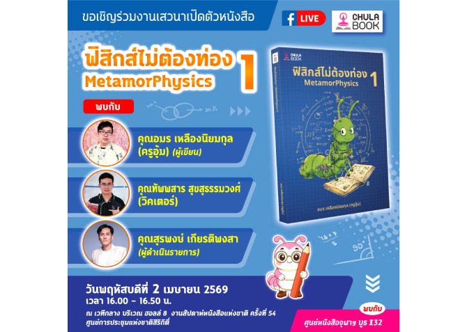 วันพฤหัสบดีที่ 2 เมษายน 2569 เวลา 16.00 – 16.50 น. งานเสวนาเปิดตัวหนังสือ “ฟิสิกส์ ไม่ต้องท่อง 1 MetamorPhysics” คู่มือเตรียมสอบฟิสิกส์