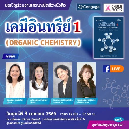 วันศุกร์ที่ 3 เมษายน 2569 เวลา 12.00 – 12.50 น. งานเสวนาเปิดตัวหนังสือ “เคมีอินทรีย์ 1 (ORGANIC CHEMISTRY)” แปลจากหนังสือต้นฉบับที่เขี