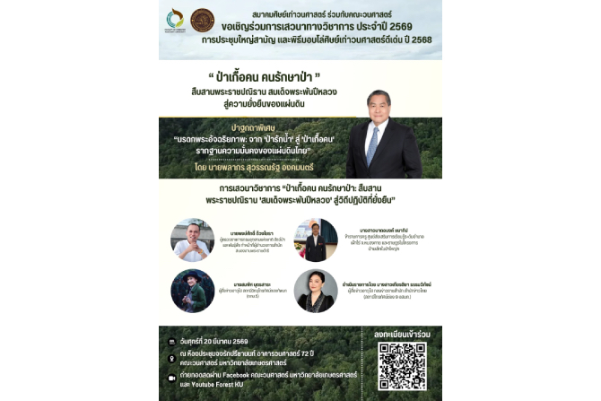 สมาคมศิษย์เก่าวนศาสตร์ ร่วมกับ คณะวนศาสตร์ มหาวิทยาลัยเกษตรศาสตร์ ได้จัดการเสวนาวิชาการหัวข้อ “ป่าเกื้อคน คนรักษาป่า: สืบสานพระราชปณิธาน ‘สมเด็จพระพันปีหลวง’ สู่ความยั่งยืนของแผ่นดิน” ในวันที่ 20 มีนาคม 2569 เวลา 9.00 – 16.00 น. ณ ห้องประชุมจงรักปรีชานนท์ อาคารวนศาสตร์ 72 ปี คณะวนศาสตร์ มหาวิทยาลัยเกษตรศาสตร์ เพื่อเผยแพร่พระราชกรณียกิ