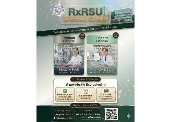 วิทยาลัยเภสัชศาสตร์ มหาวิทยาลัยรังสิต เปิดรับสมัครนักเรียนมัธยมศึกษาตอนปลาย สายวิทย์-คณิต เข้าร่วมโครงการ RxRSU DREAM CAMP เพื่อสัมผัสชีวิตนักศึกษาเภสัชฯ และเตรียมความพร้อมก่อนลงสนามสอบจริง ในวันเสาร์ที่ 9 พฤษภาคม 2569 กิจกรรมสาขา Industrial Pharmacy (สายเภสัชอุตสาหกรรม) ตั้งแต่เวลา 08.00 น. - 17.00 น. และวันอาทิตย์ที่ 10 พฤษภาคม 2569 กิจกรรมสาขา Pharmaceutical Care (สายบริบาลทางเภสัชกรรม) ตั้งแต่เวลา 08.00 น. - 17.00 น.