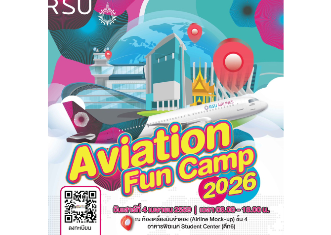 สาขาวิชาการจัดการธุรกิจการบินและการขนส่ง วิทยาลัยการท่องเที่ยวและอุตสาหกรรมการบริการ มหาวิทยาลัยรังสิต เปิดรับสมัครน้องนักเรียนมัธยมศึกษา ม.4-6 ปวช. เข้าร่วมกิจกรรม “Aviation Fun Camp 2026” จัดขึ้นในวันเสาร์ที่ 4 เมษายน 2569 เวลา 08.00 - 18.00 น. ณ ห้องเครื่องบินจำลอง (Airline Mock-up) อาคาร Student Center (อาคาร 6) มหาวิทยาลัยรังสิต
