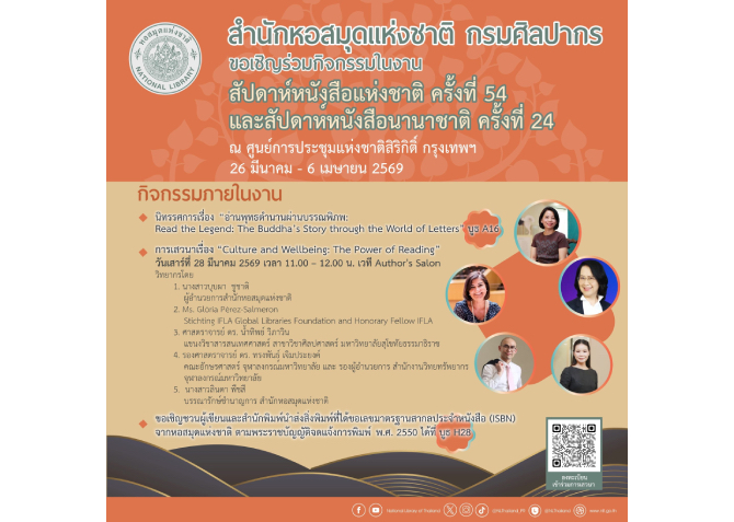 กรมศิลปากร โดยศูนย์หนังสือกรมศิลปากร ยกกองทัพหนังสือเก่า หนังสือออกใหม่ ลดราคาสูงสุดถึง 20 % ในงานสัปดาห์หนังสือแห่งชาติ ครั้งที่ 54 และสัปดาห์หนังสือนานาชาติ ครั้งที่ 24 ที่บูธ G 28 โซนหนังสือทั่วไป ตั้งแต่วันที่ 26 มีนาคม - 6 เมษายน 2569 เวลา 10.00 – 21.00 น. ณ ฮอลล์ 5 - 8 ชั้น LG ศูนย์การประชุมแห่งชาติสิริกิติ์