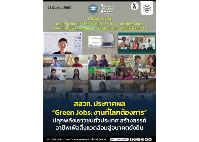 สถาบันส่งเสริมการสอนวิทยาศาสตร์และเทคโนโลยี (สสวท.) จัดพิธีประกาศผลและมอบรางวัลการประกวดคลิปวิดีโอหัวข้อ “Green Jobs: งานที่โลกต้องการ” เมื่อวันที่ 25 มีนาคม 2569 ในรูปแบบออนไลน์ โดยมี รองศาสตราจารย์ ดร.ธีระเดช เจียรสุขสกุล ผู้อำนวยการ สสวท. เป็นประธานกล่าวเปิดงานและให้โอวาท พร้อมเน้นย้ำบทบาทของ “งานสีเขียว” ในการขับเคลื่อนการพัฒนาอย่างยั่งยืน อีกทั้งชื่นชมเยาวชนที่สามารถถ่ายทอดแนวคิดด้านสิ่งแวดล้อม ผ่านผลงานอย่างสร้างสรรค์และสอดคล้องกับความท้าทายในศตวรรษที่ 21 การประกวดครั้งนี้สะท้อนให้เห็นถึงศักยภาพของผู้เรียนในการบูรณาการความรู้สู่การแก้ปัญหาจริง ขณะเดียวกันยังช่วยสร้างแรงบันดาลใจให้สังคมตระหนักถึงความสำคัญของอาชีพที่เป็นมิตรต่อสิ่งแวดล้อม โดยมีผู้ส่งผลงานเข้าร่วมทั้งสิ้น 307 ทีม จากทั่วประเทศ ผลรางวัลแบ่งออกเป็น 3 ระดับการศึกษา และมีผู้ได้รับรางวัล ดังต่อไปนี้