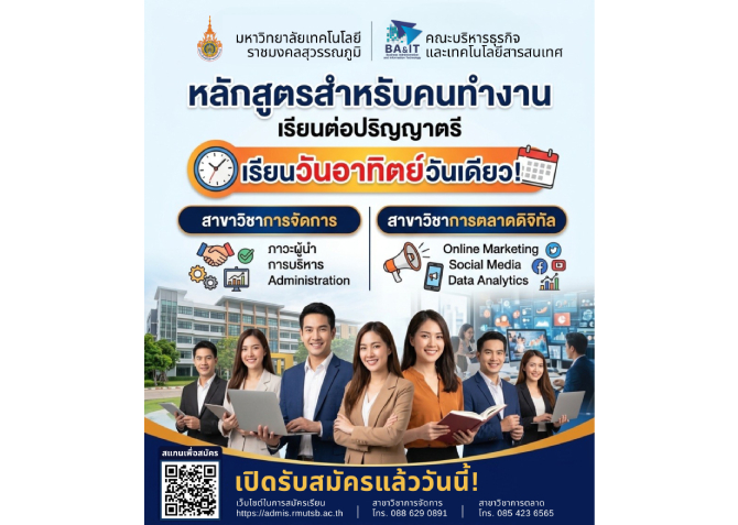 หลักสูตรเปิดสอน 2 สาขาที่ตอบโจทย์ตลาดแรงงานยุคใหม่ ได้แก่ สาขาวิชาการจัดการ มุ่งพัฒนาภาวะผู้นำและทักษะการบริหารองค์กรอย่างมืออาชีพ และ สาขาวิชาการตลาดดิจิทัล เน้นการทำการตลาดออนไลน์ การใช้สื่อสังคม และการวิเคราะห์ข้อมูลเพื่อเพิ่มขีดความสามารถทางการแข่งขัน ขณะนี้เปิดรับสมัครแล้ว ผู้สนใจสามารถสมัครผ่านเว็บไซต์ https://admis.rmutsb.ac.th หรือสอบถามข้อมูลเพิ่มเติม สาขาวิชาการจัดการ โทร. 088-629-0891 และสาขาวิชาการตลาดดิจิทัล โทร. 085-423-6565 โครงการดังกล่าวนับเป็นอีกหนึ่งแนวทางสำคัญในการเปิดโอกาสทางการศึกษาแก่ผู้ที่ต้องการเพิ่มวุฒิ พัฒนาทักษะ และสร้างความก้าวหน้าในสายอาชีพโดยไม่ต้องละทิ้งงานประจำ
