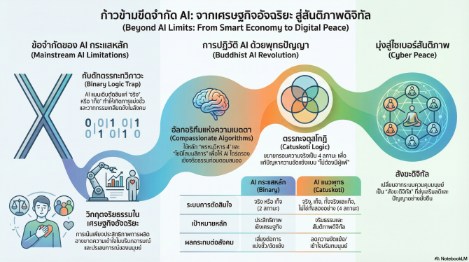 รายงานวิเคราะห์ชี้ โลกกำลังยืนบนทางแยกสำคัญของเทคโนโลยี AI ระหว่างโมเดลเน้นประสิทธิภาพเชิงเศรษฐกิจ กับแนวคิดใหม่ที่ผสานจริยธรรมและพุทธปัญญา เพื่อแก้ปัญหาความขัดแย้งระดับโลก