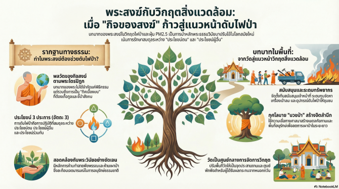 นักวิชาการชี้บทบาทพระสงฆ์ช่วยดับไฟป่า–ฝุ่น PM2.5 ไม่ใช่เรื่องนอกกรอบ แต่สอดคล้อง “กิจของสงฆ์” ในพระไตรปิฎก ที่เน้นทั้งการขัดเกลาตนเองและเกื้อกูลสังคม