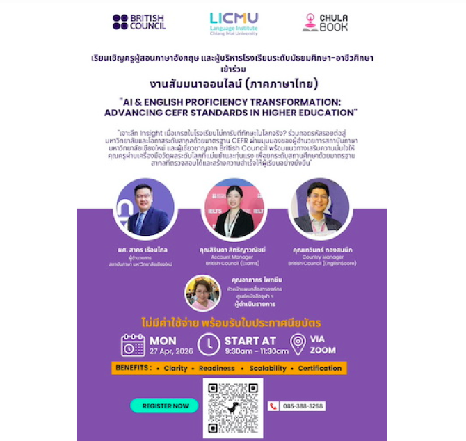 ศูนย์หนังสือจุฬาฯ ร่วมกับ สถาบันภาษา มหาวิทยาลัยเชียงใหม่ และ British Council Thailand ขอเรียนเชิญครูผู้สอนภาษาอังกฤษ และผู้บริหารโรงเรียนระดับมั