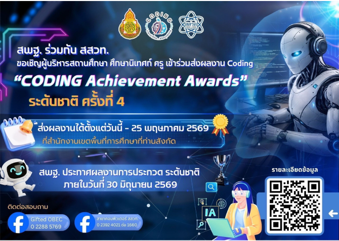 สถาบันส่งเสริมการสอนวิทยาศาสตร์และเทคโนโลยี (สสวท.) ร่วมกับสำนักงานคณะกรรมการการศึกษาขั้นพื้นฐาน (สพฐ.) ขอเชิญผู้บริหารสถานศึกษา ศึกษานิเทศก์ และครูผู้สอนในสังกัด สพฐ. ทั่วประเทศ ร่วมส่งผลงานเข้าประกวดในเวทีระดับชาติ “CODING Achievement Awards” ครั้งที่ 4 เพื่อเผยแพร่และแลกเปลี่ยนองค์ความรู้ด้าน Coding & AI พร้อมคัดเลือกผลงานต้นแบบและยกย่องเชิดชูเกียรติบุคลากรทางการศึกษา โดยผู้มีสิทธิ์ส่งผลงานต้องสังกัดหน่วยงานใน สพฐ. และส่งผลงานผ่านสำนักงานเขตพื้นที่การศึกษาที่สังกัด (สพท.) ภายในวันที่ 25 พฤษภาคม 2569 ก่อนเข้าสู่กระบวนการคัดเลือกระดับเขตภายในวันที่ 8 มิถุนายน 2569 และประกาศผลระดับชาติภายในวันที่ 30 มิถุนายน 2569 ทั้งนี้ ผลงานที่ได้รับการคัดเลือกจะได้ร่วมจัดแสดงและ รับรางวัลในวันที่ 24–26 กรกฎาคม 2569 ณ มหาวิทยาลัยราชภัฏราชนครินทร์ ศึกษารายละเอียด หลักเกณฑ์ และเงื่อนไขการส่งผลงานเพิ่มเติมได้ที่เว็บไซต์ https://oho.ipst.ac.th/ai/prcoding69 และ Facebook สาขาคอมพิวเตอร์ สสวท. https://web.facebook.com/oho.ipst