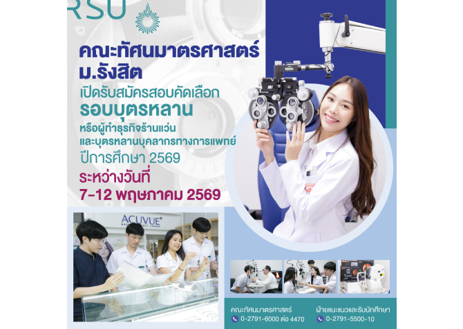 คณะทัศนมาตรศาสตร์ ม.รังสิต เปิดรับสมัครสอบคัดเลือก รอบบุตรหลาน หรือผู้ทำธุรกิจร้านแว่น และบุตรหลานของบุคลากรทางการแพทย์ ปีการศึกษา’69