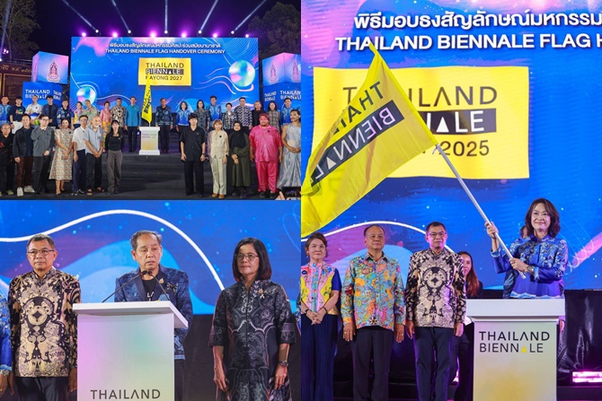 เมื่อวันเสาร์ที่ 25 เมษายน 2569 เวลา 18.30 น. นางสาวซาบีดา ไทยเศรษฐ์ รัฐมนตรีว่าการกระทรวงวัฒนธรรม มอบหมายให้นายประสพ เรียงเงิน ปลัดกระทรวงวัฒนธรรม เป็นประธานพิธีมอบธงสัญลักษณ์โครงการมหกรรมศิลปะร่วมสมัยนานาชาติ Thailand Biennale ให้กับจังหวัดระยอง โดยมีนายธีระพงศ์ ช่วยชู รองผู้ว่าราชการจังหวัดภูเก็ต นางสาวสลารีวรรณ ทัพทวี รองผู้ว่าราชการจังหวัดระยอง นางเกษร กำเหนิดเพ็ชร ผู้อำนวยการสำนักงานศิลปวัฒนธรรมร่วมสมัย (สศร.) ผู้บริหารกระทรวงวัฒนธรรม (วธ.) คณะกรรมการดำเนินโครงการฯ นางพวงผกา เชาวน์ไวย วัฒนธรรมจังหวัดภูเก็ต นายวรวุฒิ ด่านสมพงศ์ วัฒนธรรมจังหวัดระยอง นางอัญชลี วานิช เทพบุตร นายกสมาคมศิลป์ภูเก็จ นายสาธิต ปิตุเตชะ อดีตรัฐมนตรีช่วยว่าการกระทรวงสาธารณสุข นายเรวัต อารีรอบ นายกองค์การบริหารส่วนจังหวัดภูเก็ต ผู้แทนองค์กรปกครองส่วนท้องถิ่นในจังหวัดภูเก็ต นายอริญชย์ รุ่งแจ้ง และ Mr. David Teh ผู้อำนวยการฝ่ายศิลป์โครงการฯ นางสาว มาริสา พันธรักษ์ราชเดช และ Ms. Hera Chan ภัณฑารักษ์โครงการฯ ศิลปินชาวไทย ศิลปินชาวต่างชาติ ผู้แทนหน่วยงานรัฐ เอกชน เครือข่ายศิลปินจังหวัดภูเก็ต ศิลปินระยอง ศิลปินส่วนภูมิภาคและสื่อมวลชน เข้าร่วม ณ สวนเฉลิมพระเกียรติ 72 พรรษา มหาราชินี (ลานมังกร) อำเภอเมืองภูเก็ต จังหวัดภูเก็ต